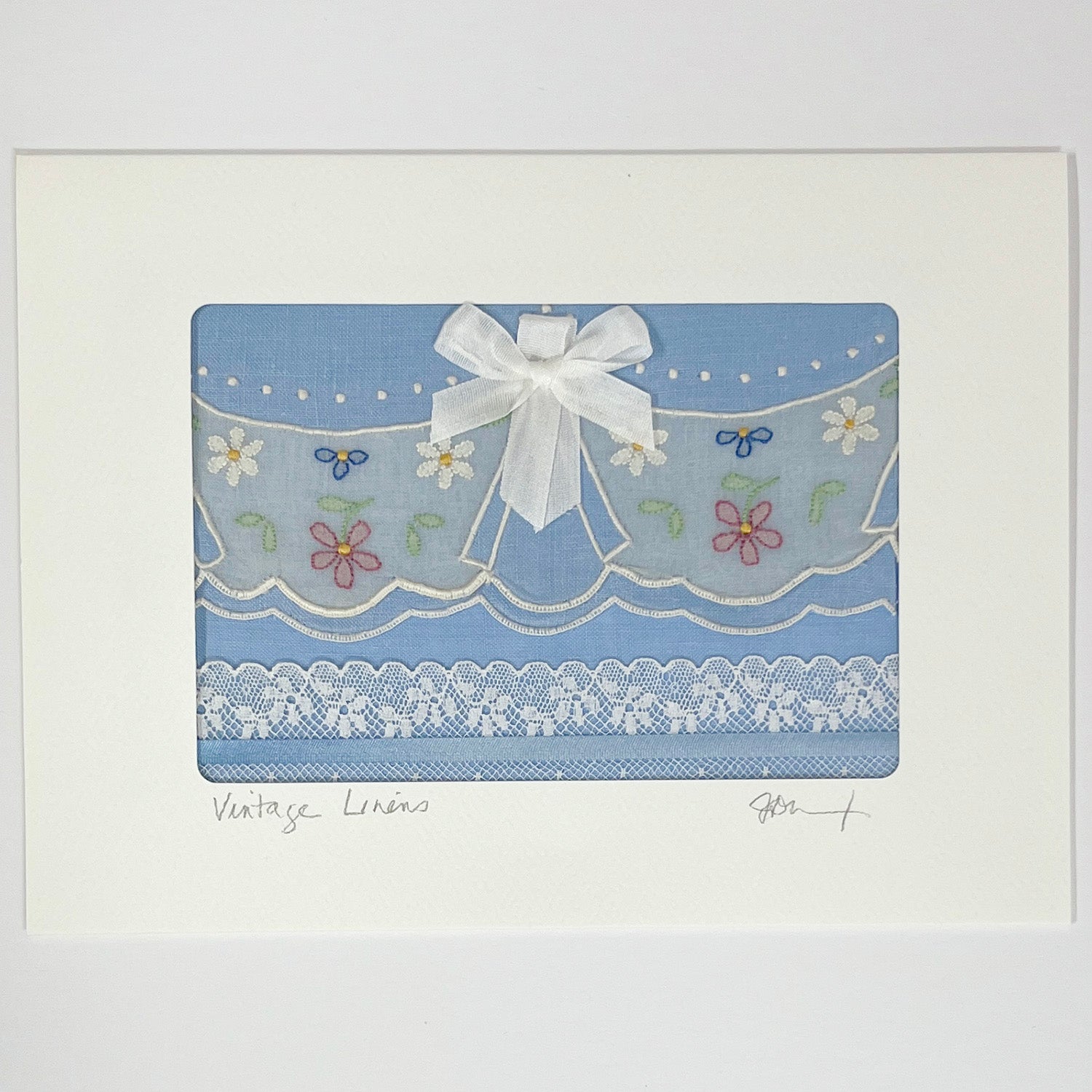 Jill Breaux's vintage linen blank greeting cards. Jill uses our hand dyed silk ribbons and gives a new life to repurposed old vintage linens. Each card is made tenderly with love and attention to detail. These one of a kind beautiful cards are the perfect addition to any gift for a special occasion, loved one or friend. Or get one for yourself, just because - and frame them in your favorite space because they are that pretty!