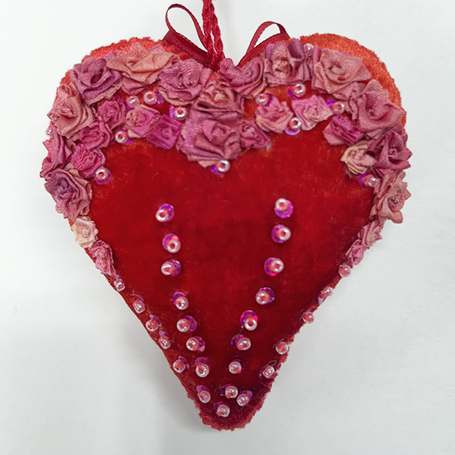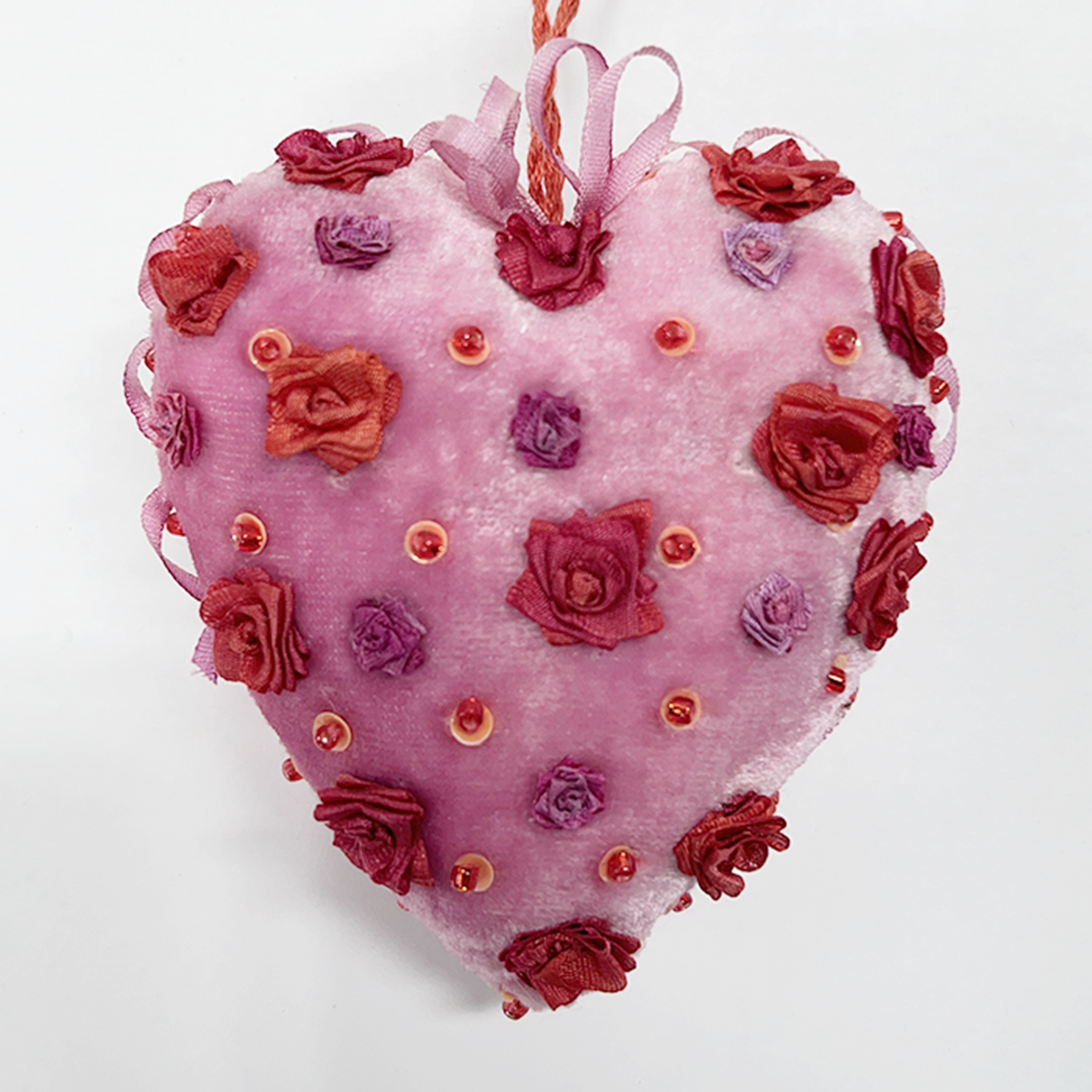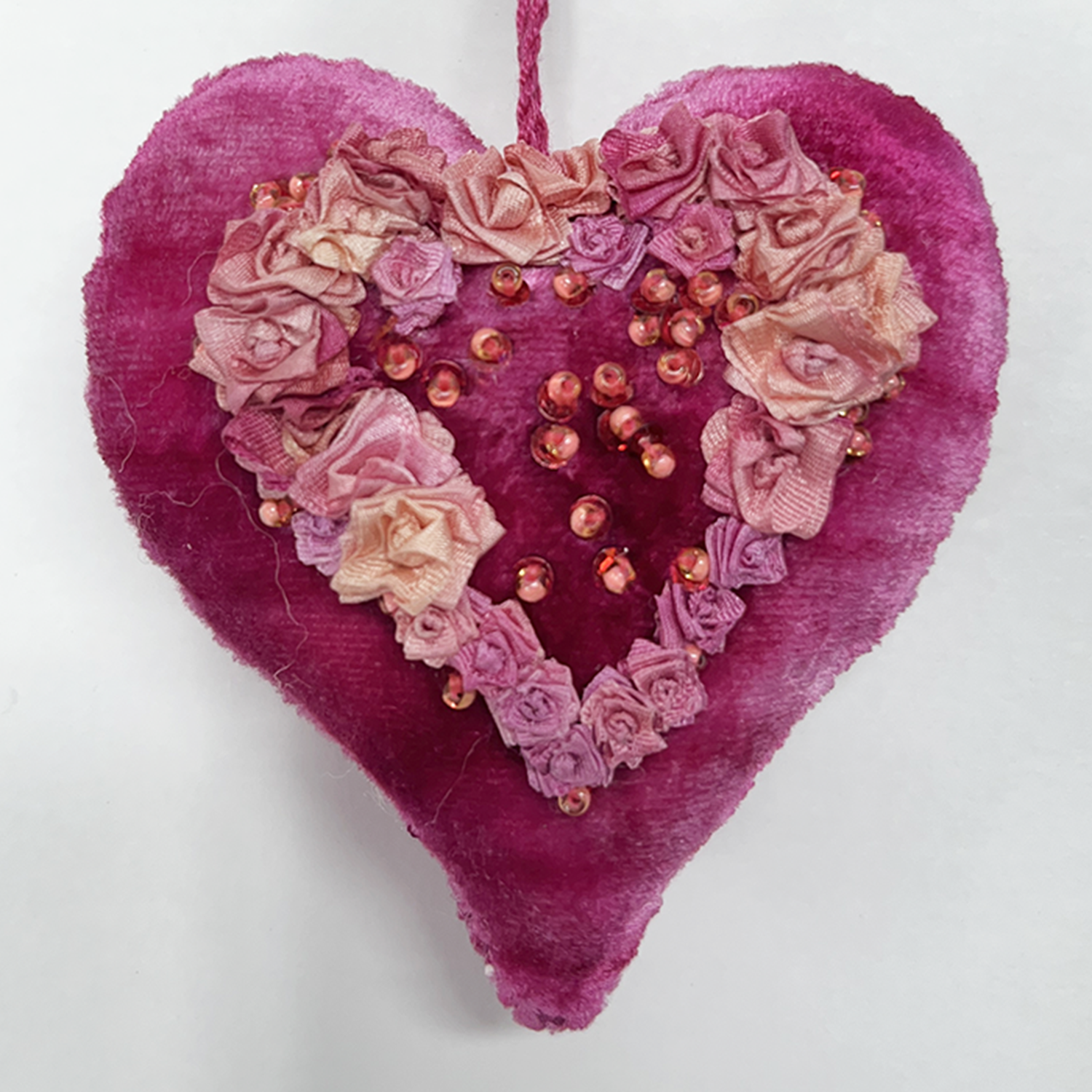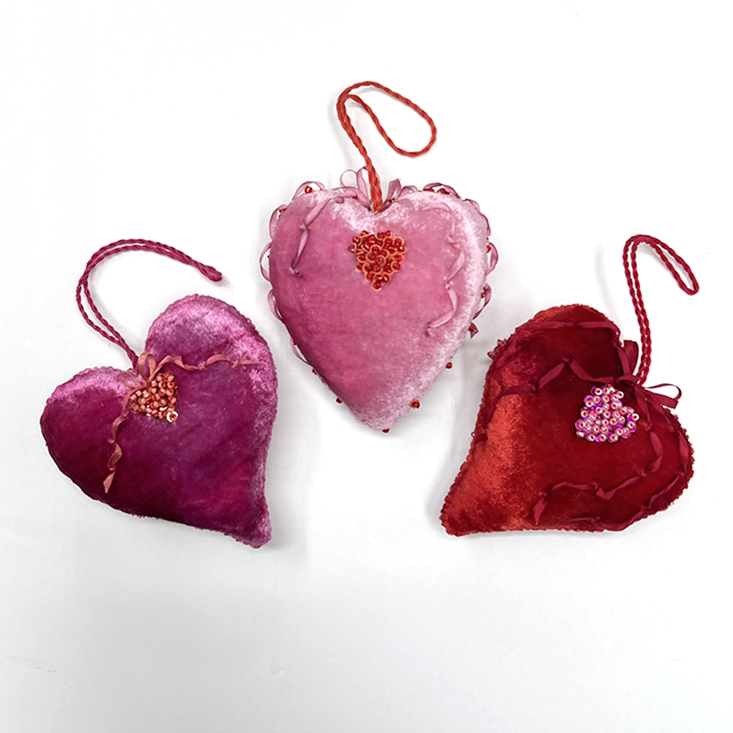 Comprised of Sweet Pea, Cabbage Rose and Candy Apple velvets, our velvet hearts kit also contains ribbon, floss, sequins, beads and interfacing to make three hearts, along with complete instructions and patterns. There are three different heart shapes and three different designs to embroider. One design is a heart outline, one is a gridded pattern and one is festooned heart top. Only three stitches are needed for each embellishment design: the French Knot Rose, MJ's Cascaded Ribbon and the Anchored Sequin. The ribbon, floss, sequins and beads provided for each design are the same in terms of amounts. This means you can embroider any of the three designs on any of the heart shapes. Each heart back is embellished with a tiny beaded heart and cascaded ribbon, so that if your heart twirls, the back will provide a pleasant little surprise.