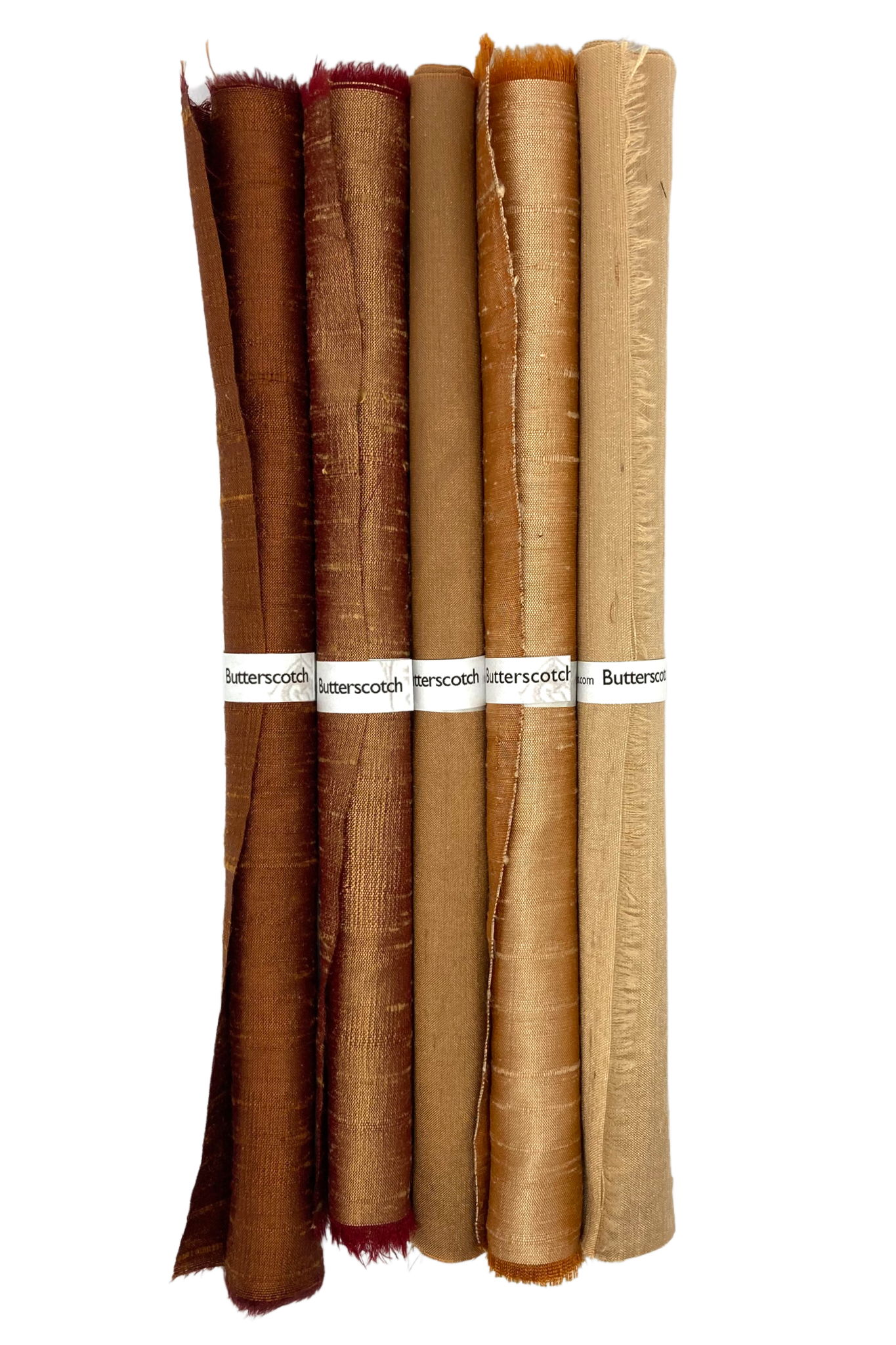 Silk dupioni sets contain five pieces of silk dupioni, or occasionally silk shantung or metallic blends, with each piece measuring approximately 8" x 11"