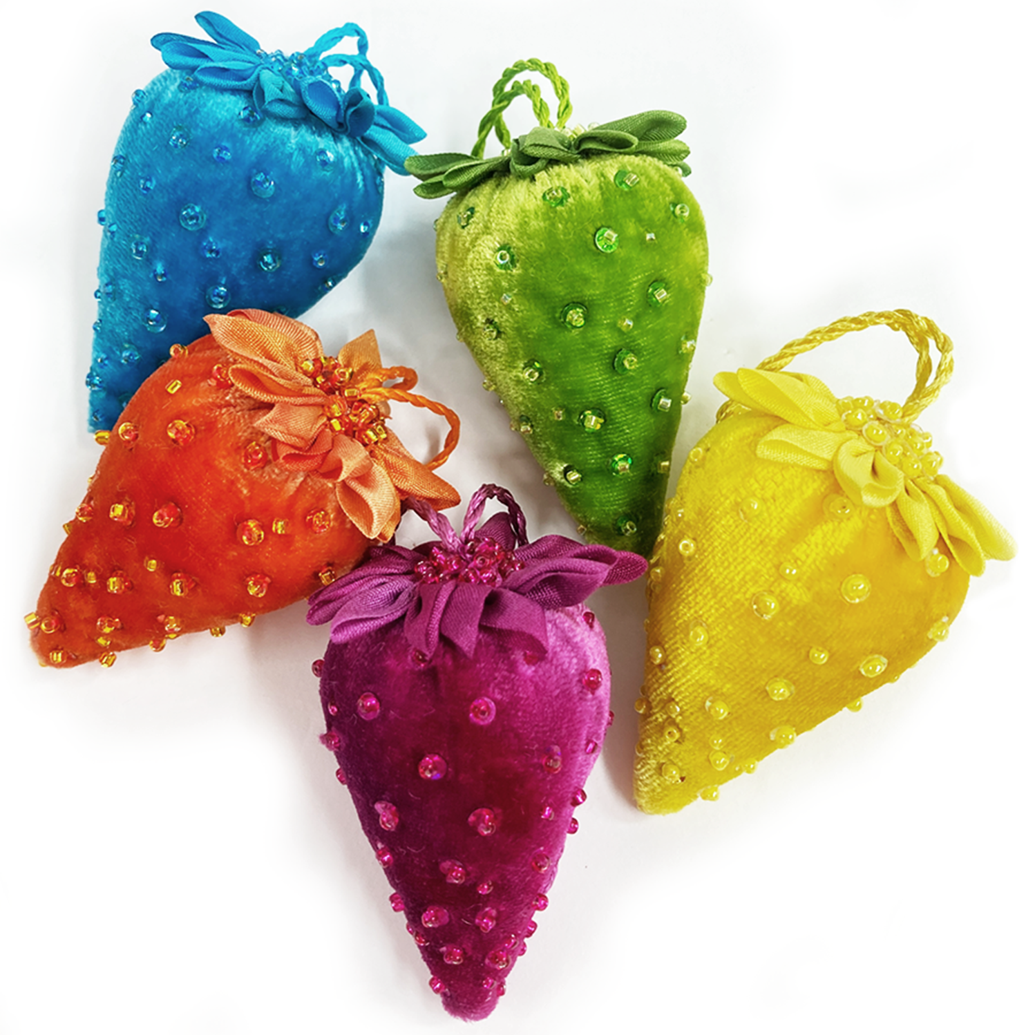 Comprised of Island Blue, Lime, Nasturtium, Petunia and Sunny Day velvets, our candied strawberries kit also contains ribbon, floss, sequins, beads, play sand and interfacings to make five strawberries, along with complete instructions and patterns.