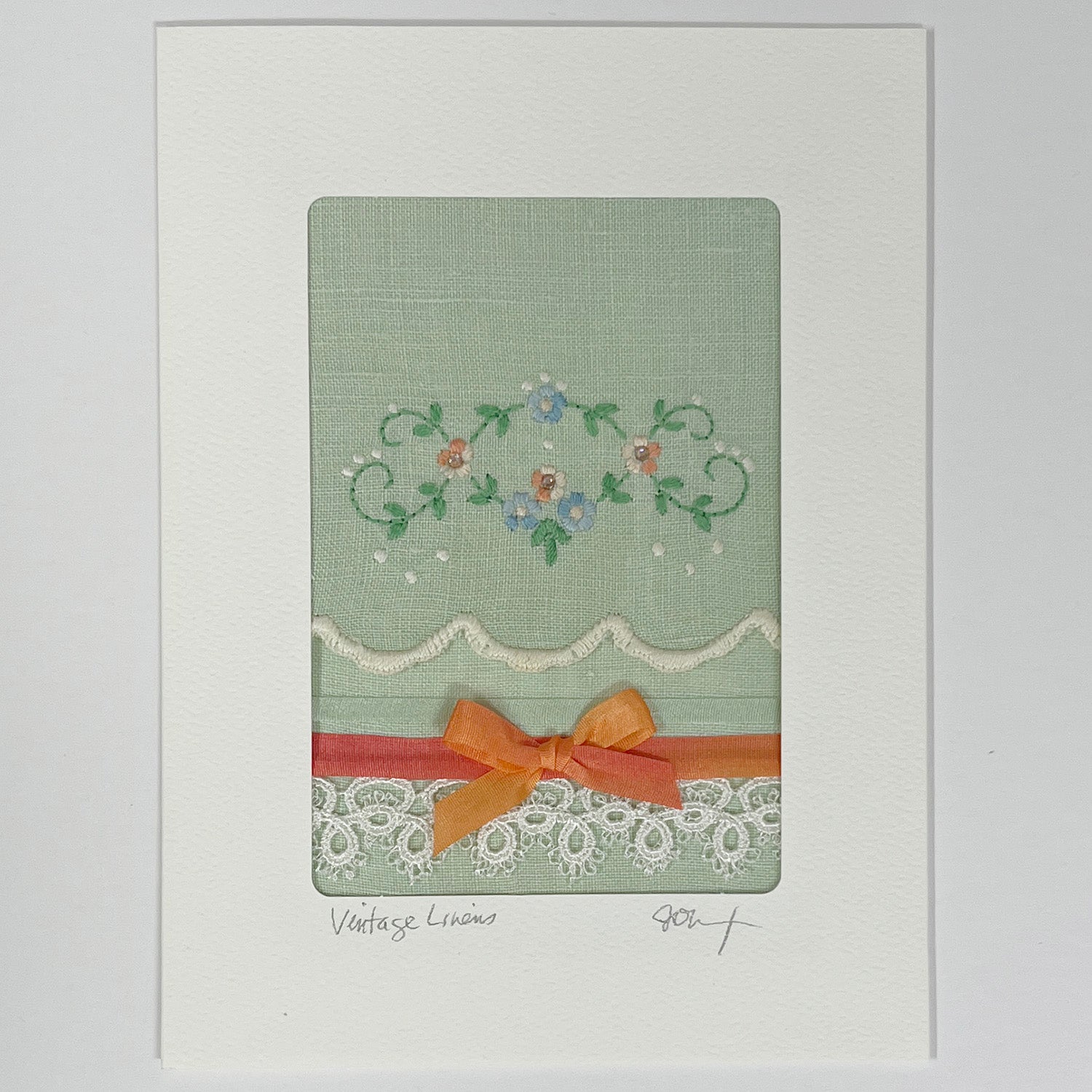 Jill Breaux's vintage linen blank greeting cards. Jill uses our hand dyed silk ribbons and gives a new life to repurposed old vintage linens. Each card is made tenderly with love and attention to detail. These one of a kind beautiful cards are the perfect addition to any gift for a special occasion, loved one or friend. Or get one for yourself, just because - and frame them in your favorite space because they are that pretty!