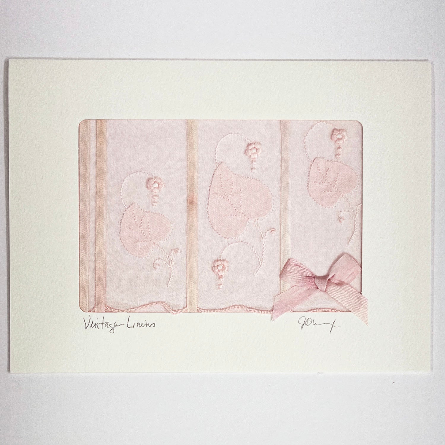 Jill Breaux's vintage linen blank greeting cards. Jill uses our hand dyed silk ribbons and gives a new life to repurposed old vintage linens. Each card is made tenderly with love and attention to detail. These one of a kind beautiful cards are the perfect addition to any gift for a special occasion, loved one or friend. Or get one for yourself, just because - and frame them in your favorite space because they are that pretty!