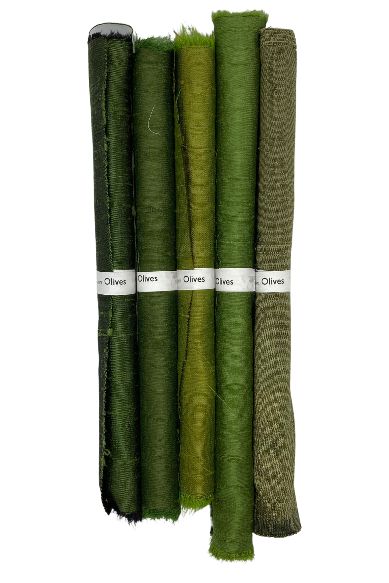 Silk dupioni sets contain five pieces of silk dupioni, or occasionally silk shantung or metallic blends, with each piece measuring approximately 8" x 11"