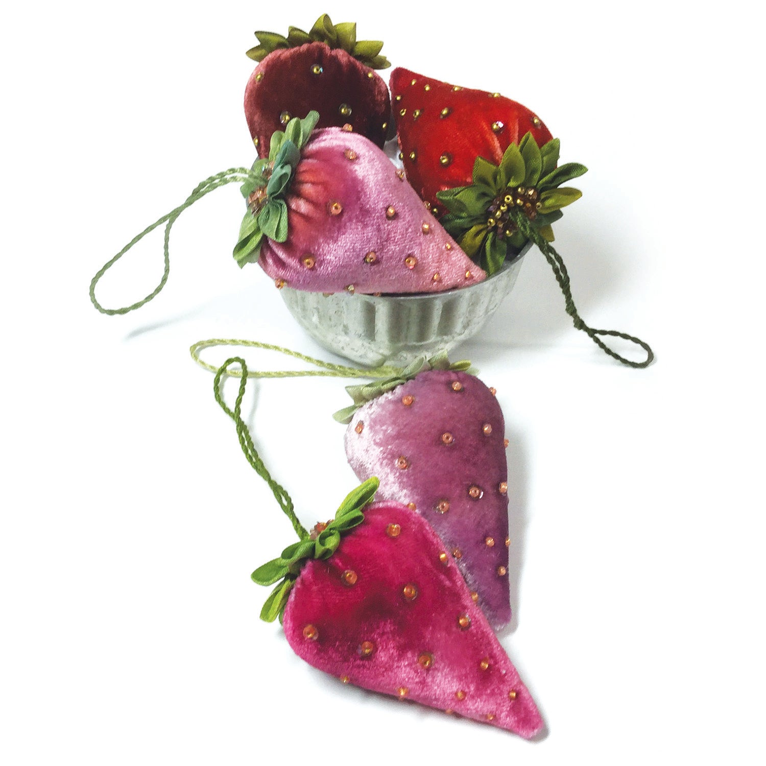 Comprised of Tomato, Rosehip, Floribunda, Raspberry and Sweet Pea velvets, our original strawberries kit also contains ribbon, floss, sequins, beads, play sand and interfacings to make five strawberries, along with complete instructions and patterns.