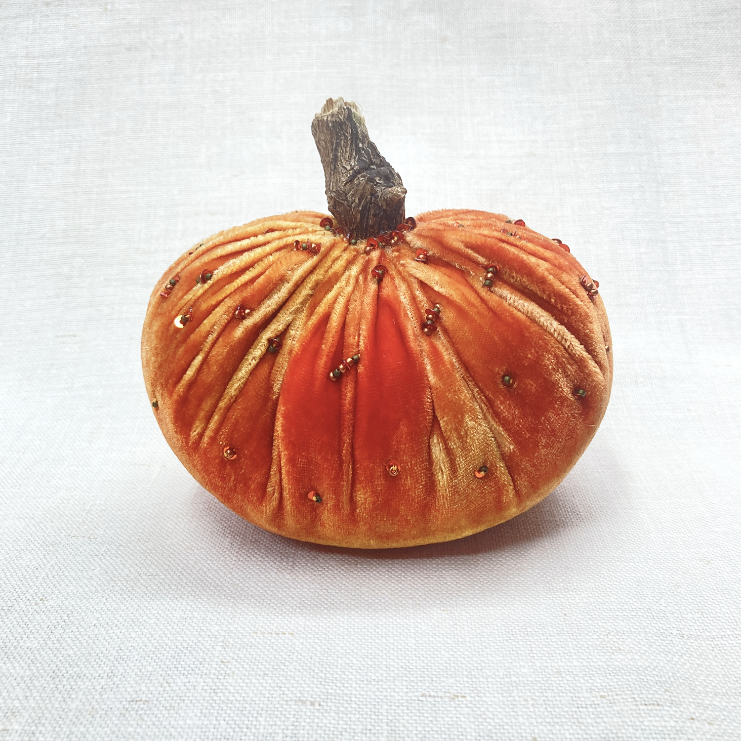 In Marigold velvet, our velvet pumpkin kit also contains ribbon, sequins, beads to make one pumpkin, along with complete instructions and patterns.