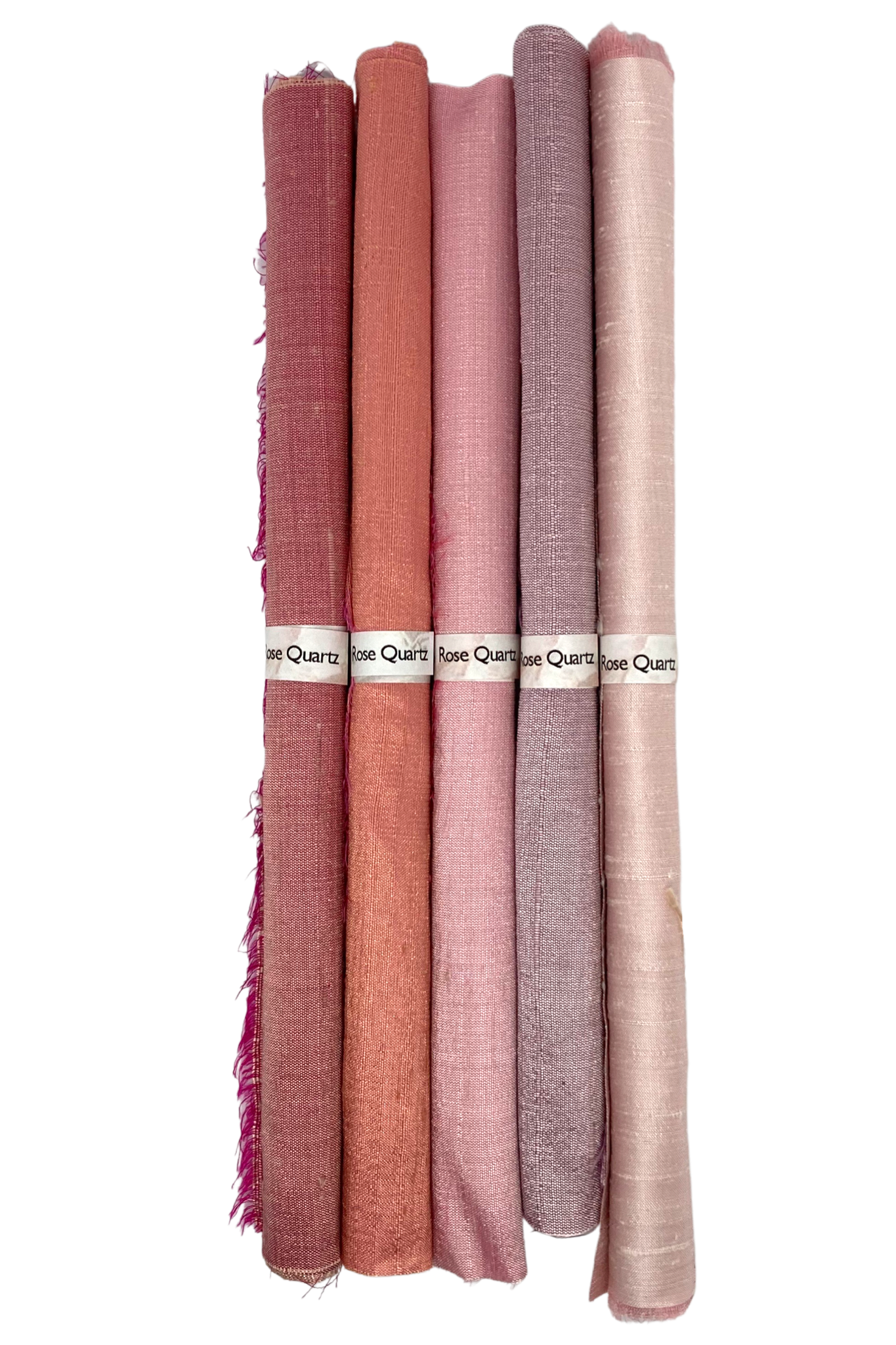 Silk dupioni sets contain five pieces of silk dupioni, or occasionally silk shantung or metallic blends, with each piece measuring approximately 8" x 11"