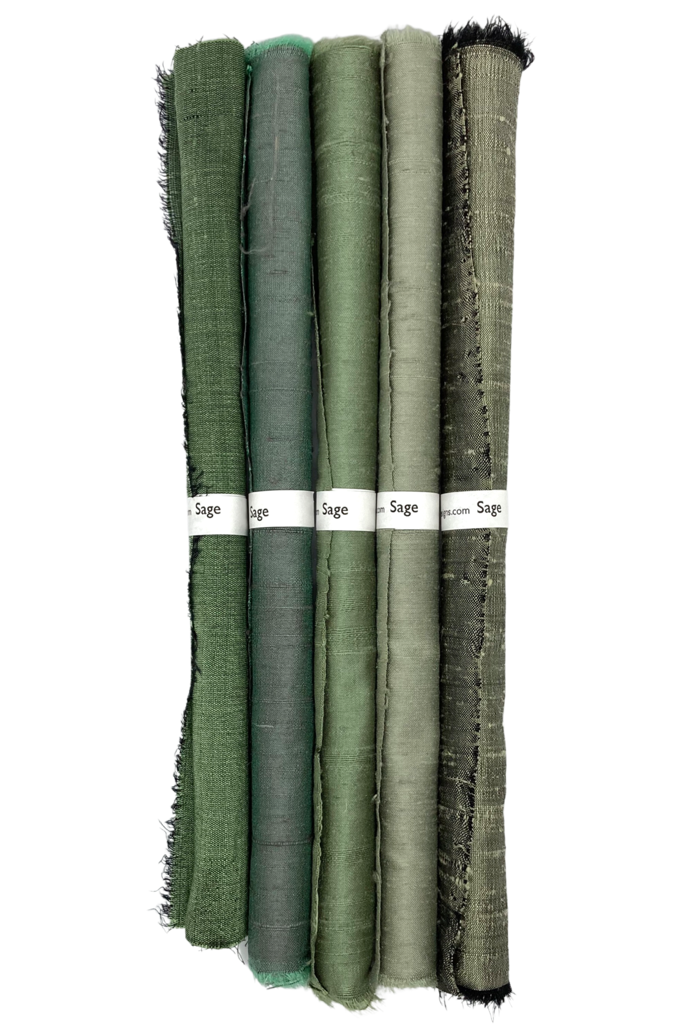 Silk dupioni sets contain five pieces of silk dupioni, or occasionally silk shantung or metallic blends, with each piece measuring approximately 8" x 11"