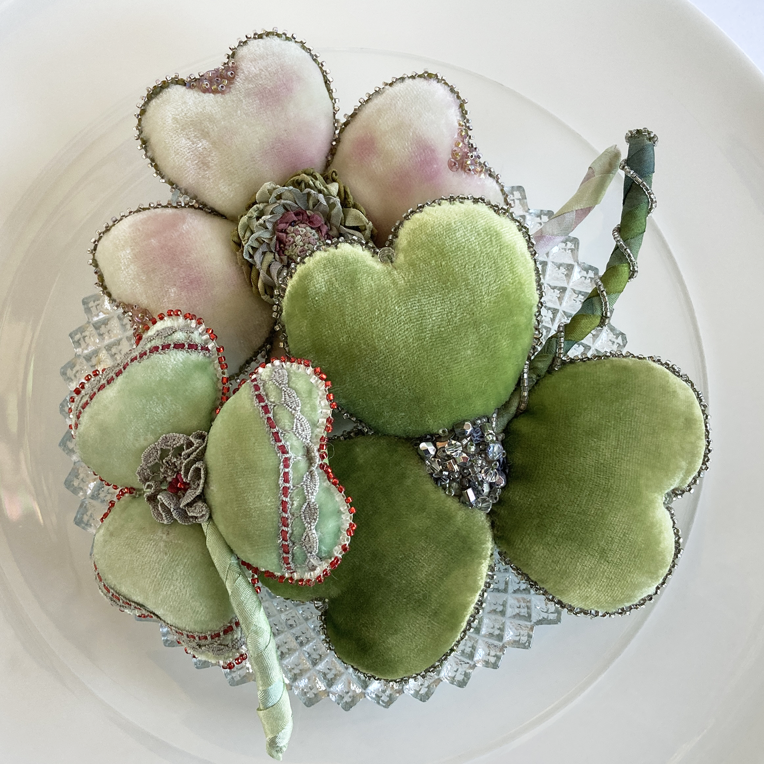 Comprised of Lime, Pink-Kissed Mint and Spring Green velvets, our shades of green velvet clovers kit also contains ribbons, floss, sequins, beads, French lace (smallest clover), interfacings, assembly essentials, complete instructions and patterns.