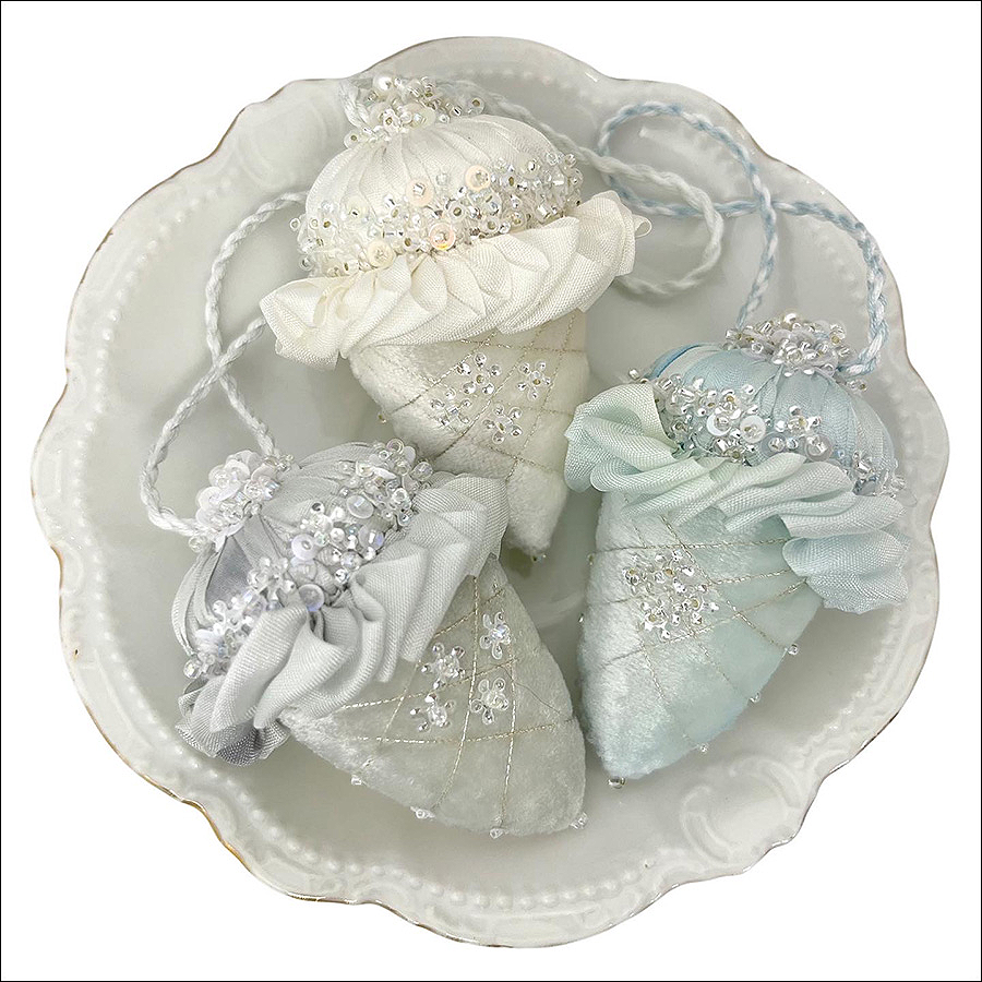 Comprised of Platinum, Arctic Blue and White velvets, our snowy velvet acorns kit also contains ribbon, floss, sequins, beads, interfacing, complete instructions and patterns.
