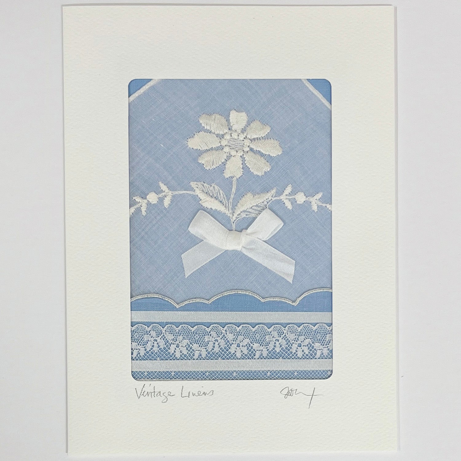 Jill Breaux's vintage linen blank greeting cards. Jill uses our hand dyed silk ribbons and gives a new life to repurposed old vintage linens. Each card is made tenderly with love and attention to detail. These one of a kind beautiful cards are the perfect addition to any gift for a special occasion, loved one or friend. Or get one for yourself, just because - and frame them in your favorite space because they are that pretty!