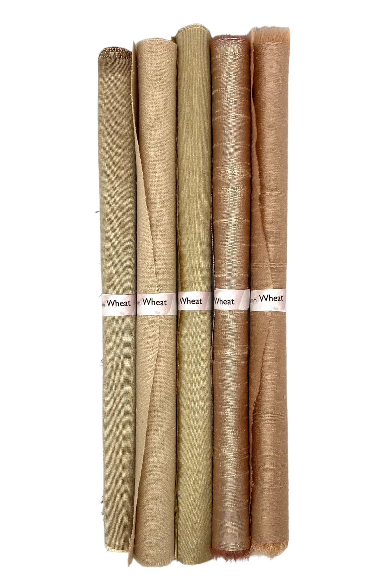 Silk dupioni sets contain five pieces of silk dupioni, or occasionally silk shantung or metallic blends, with each piece measuring approximately 8" x 11"